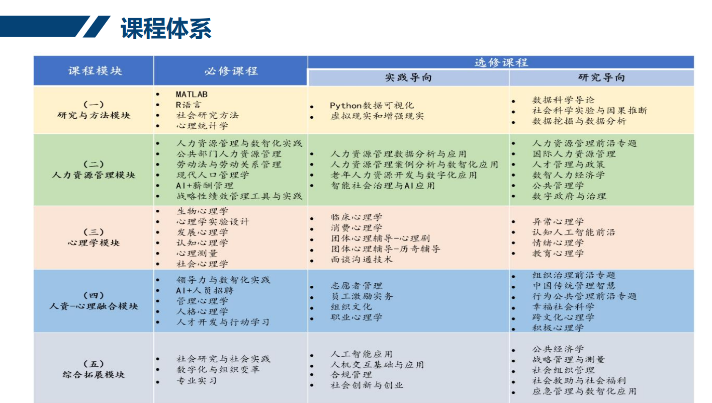 ④数智培育目标。掌握社会科学研究方法,具备满足数智时代组织管理与人力资源管理需要的信息与数据处理分析能力,具备出色的数智化思维与人工智能运用技能。