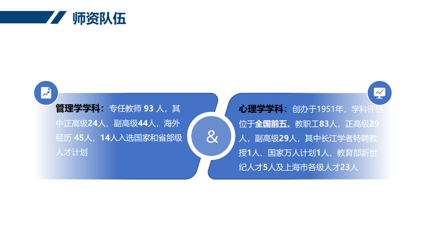 “人力资源管理-应用心理学”双学位项目师资依托管理学和心理学两个学科。管理学学科包含公共管理和工商管理两个一级学科,教师队伍强大,专任教师93人,其中正高级24人、副高级44人,海外经历45人,14人入选国家和省部级人才计划。心理学学科1951年创办,1979年成立心理学系(国内最早建系四所之一)。1997年获批心理学国家理科基地,在近两次学科评估中,心理学科稳定在全国前五。现有教职工83人,正高级29人,副高级29人,其中国家级人才计划特聘教授1人、教育部新世纪人才5人及上海市各级人才23人。