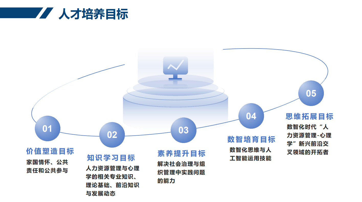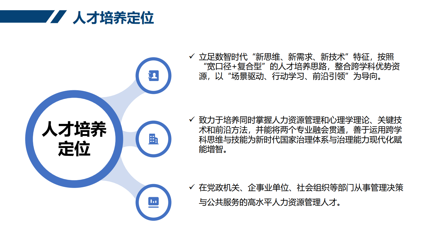 立足数智时代“新思维、新需求、新技术”特征,按照“宽口径+复合型”的人才培养思路,整合跨学科优势资源,以“场景驱动、行动学习、前沿引领”为导向,致力于培养同时掌握人力资源管理和心理学理论、关键技术和前沿方法,并能将两个专业融会贯通,善于运用跨学科思维与技能为新时代国家治理体系与治理能力现代化赋能增智,在党政机关、企事业单位、社会组织等部门从事管理决策与公共服务的高水平人力资源管理人才。